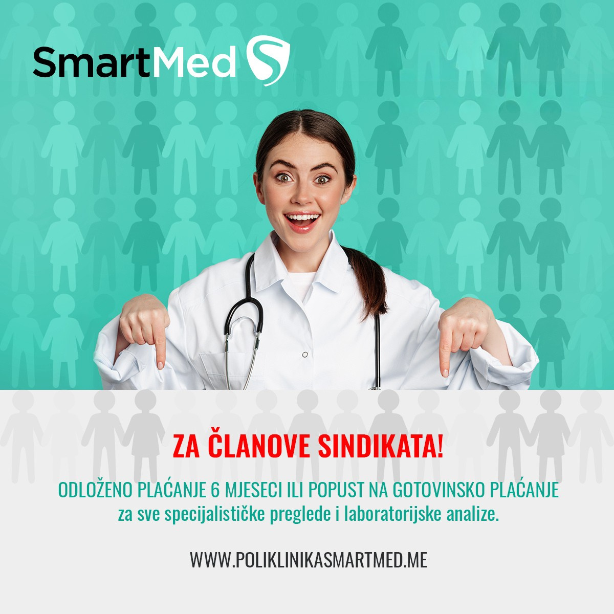 Sve sindikalne organizacije u Crnoj Gori koje imaju sklopljen ugovor sa Poliklinikom Smart Med i Laboratorijom SmartLab, ostvaruju pravo na odloženo plaćanje do 6 mjeseci ili popust, ukoliko se plaćanje obavlja gotovinski. Pogodnosti važe za sve specijalističke preglede i laboratorijske analize.